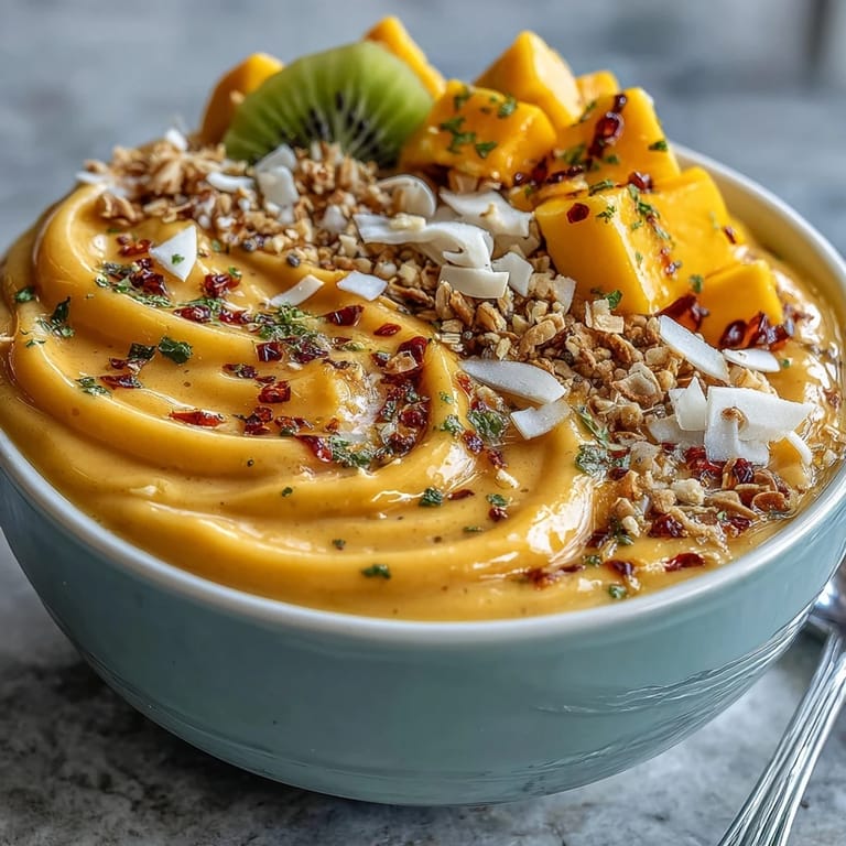 Save The first time I made this Mango Chili Lime Smoothie Bowl, my kitchen filled with the tangy scent of freshly cut lime and a gentle hum from the blender bouncing off the counter. The contrast of velvety mango with a flicker of chili heat was unexpected and delightful. I remember pausing to admire the golden color, deciding whether to share it or keep it just for myself. Citrus zest lingered in the air, and I smiled, thinking this bowl could wake up even the sleepiest morning.